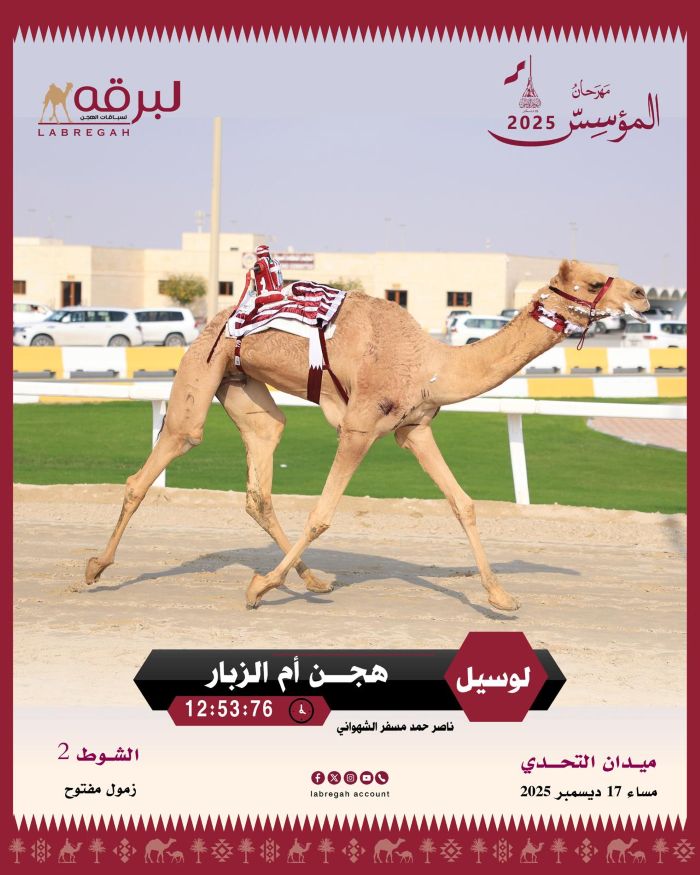 منافسات قوية شهدها ميدان التحدي مساء اليوم الأربعاء 17 ديسمبر 2025، حيث تحديات اليوم الختامي لهجن أصحاب السمو والسعادة الشيوخ بمهرجان المؤسس الشيخ جاسم بن محمد بن ثاني طيب الله ثراه، لسباق الهجن العربية الأصيلة، والتي خصصت لأشواط الحيل والزمول وجرت من مسافة 8 كم.