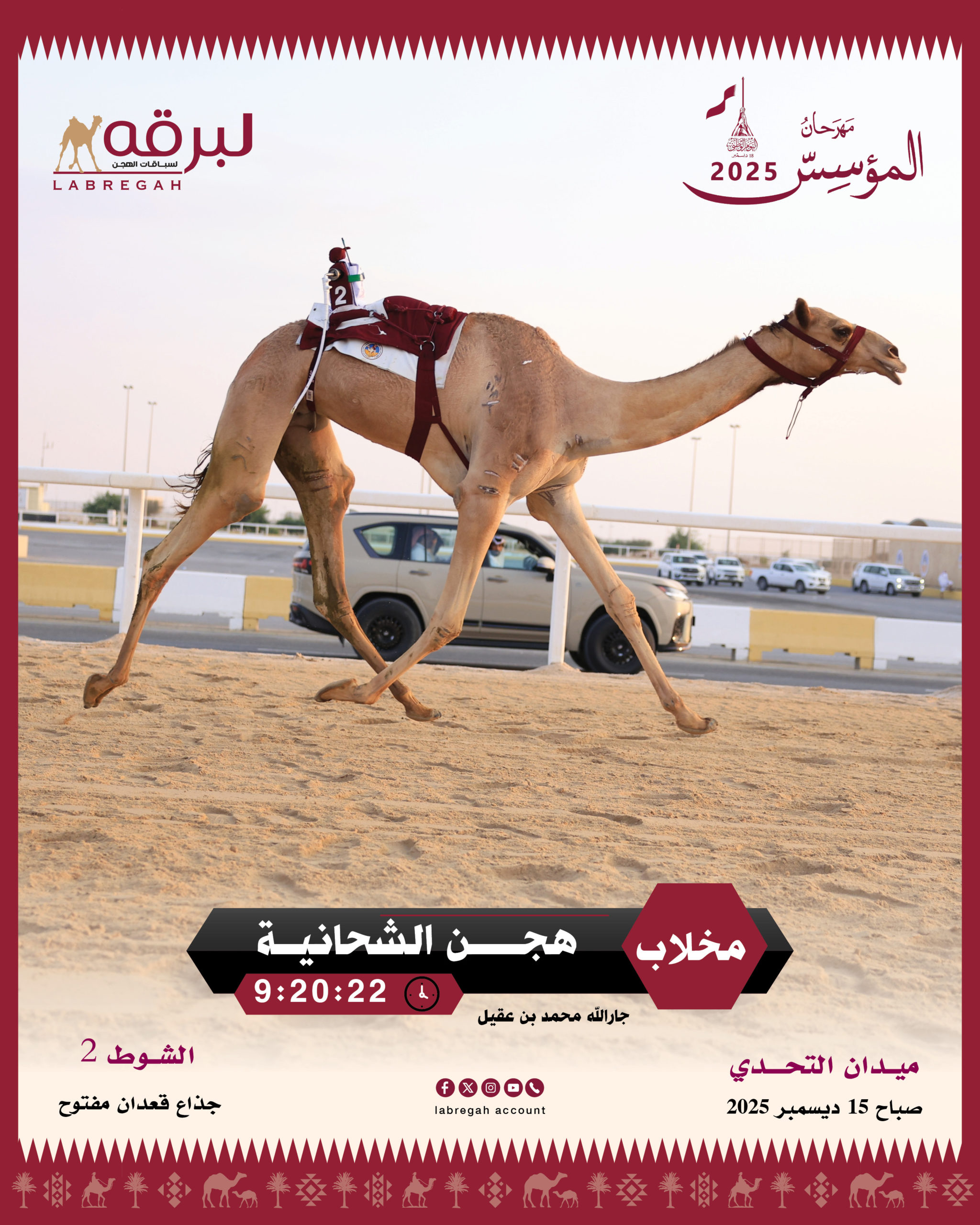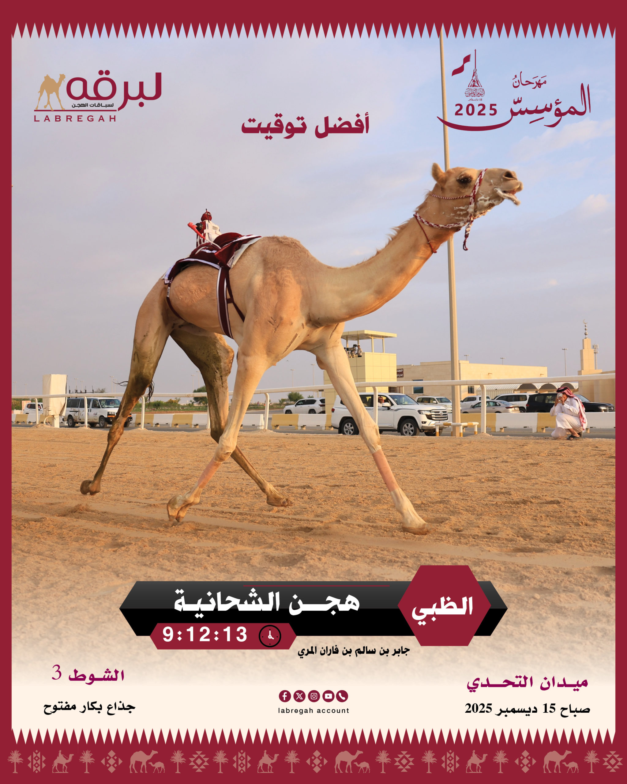 في أجواء مفعمة بالحيوية والإثارة، أقيمت صباح اليوم الإثنين 15 ديسمبر 2025، تحديات فئة جديدة من منافسات مهرجان المؤسس الشيخ جاسم بن محمد بن ثاني “طيب الله ثراه”، للهجن العربية الأصيلة على أرضية ميدان التحدي، والذي يأتي مواكبًا لاحتفال الدولة بيومها الوطني، وخصصت منافسات اليوم لسن الجذاع من هجن أصحاب السمو والسعادة الشيوخ، على مدار 10 أشواط من مسافة الـ 6 كيلومترات، وفيها..