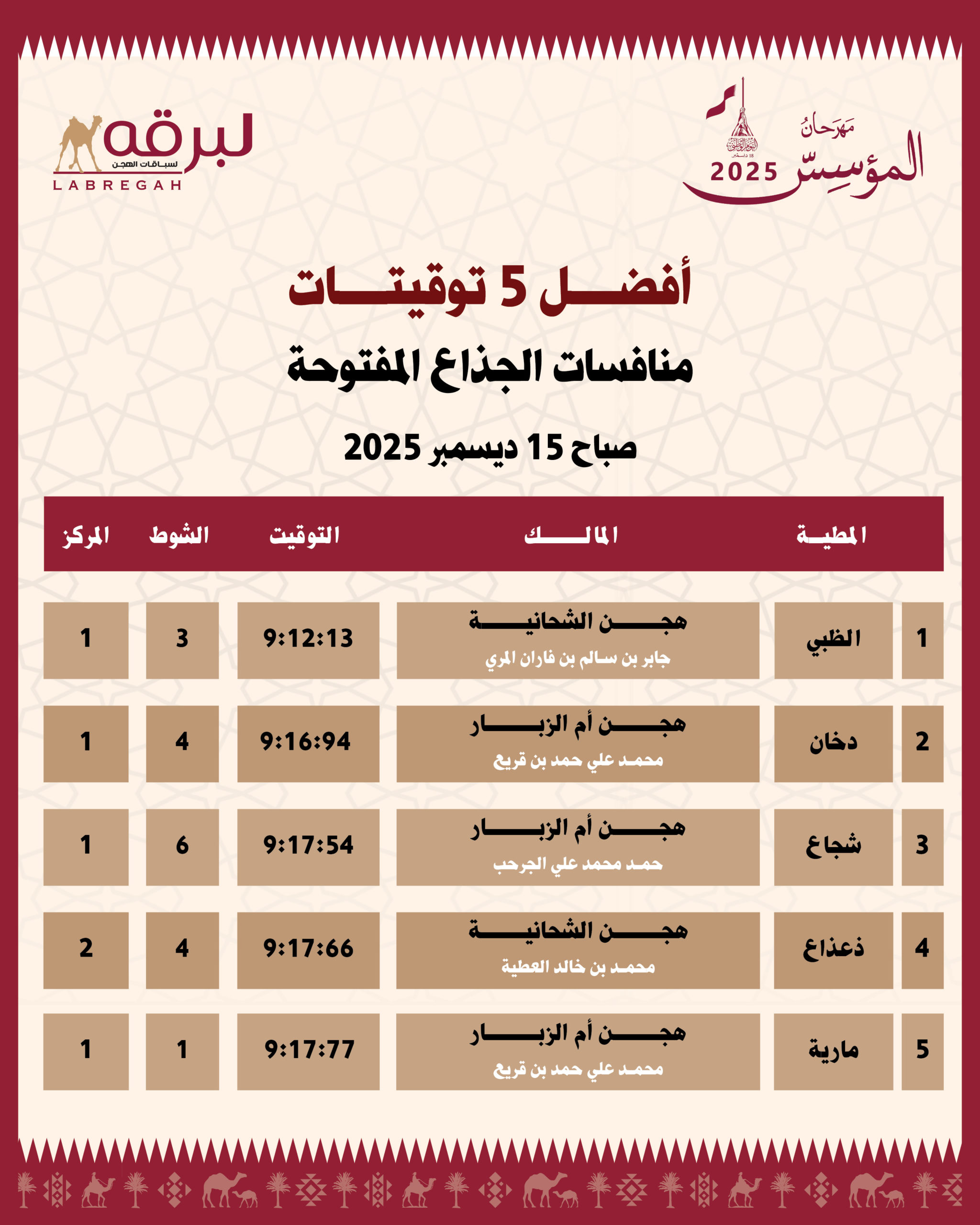 | قعدان مفتوح | 2 | ذعذاع | هجن الشحانية | محمد بن خالد العطية | 9:17:66 |