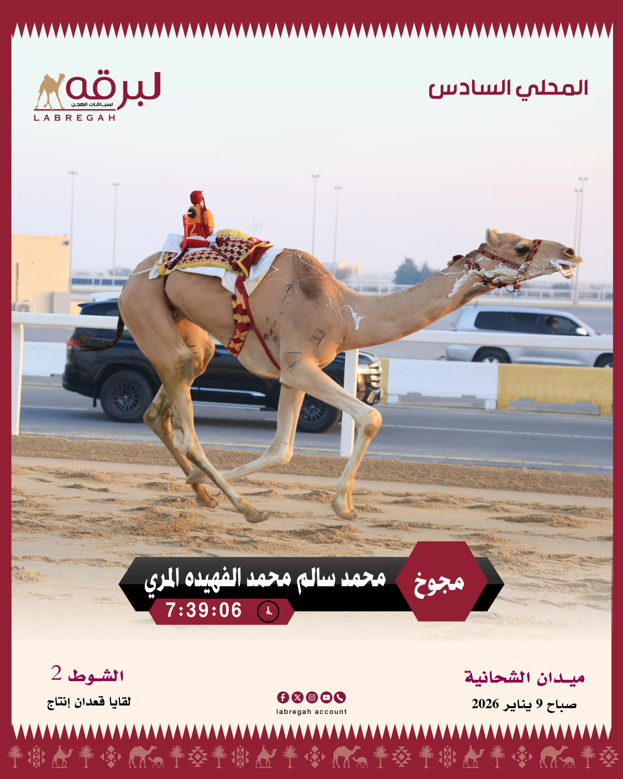 وعلى صعيد اللقايا قعدان إنتاج، احتفل محمد سالم محمد الفهيده المري، مالك “مجوخ” بفوزه بناموس الشوط الرئيسي للقايا قعدان إنتاج، وذلك بعد أن أثبت “مجوخ” جاهزيته العالية وانسجامه الواضح لتعليمات مضمره، حيث قطع مسافة السباق في 7.39.06 دقيقة.