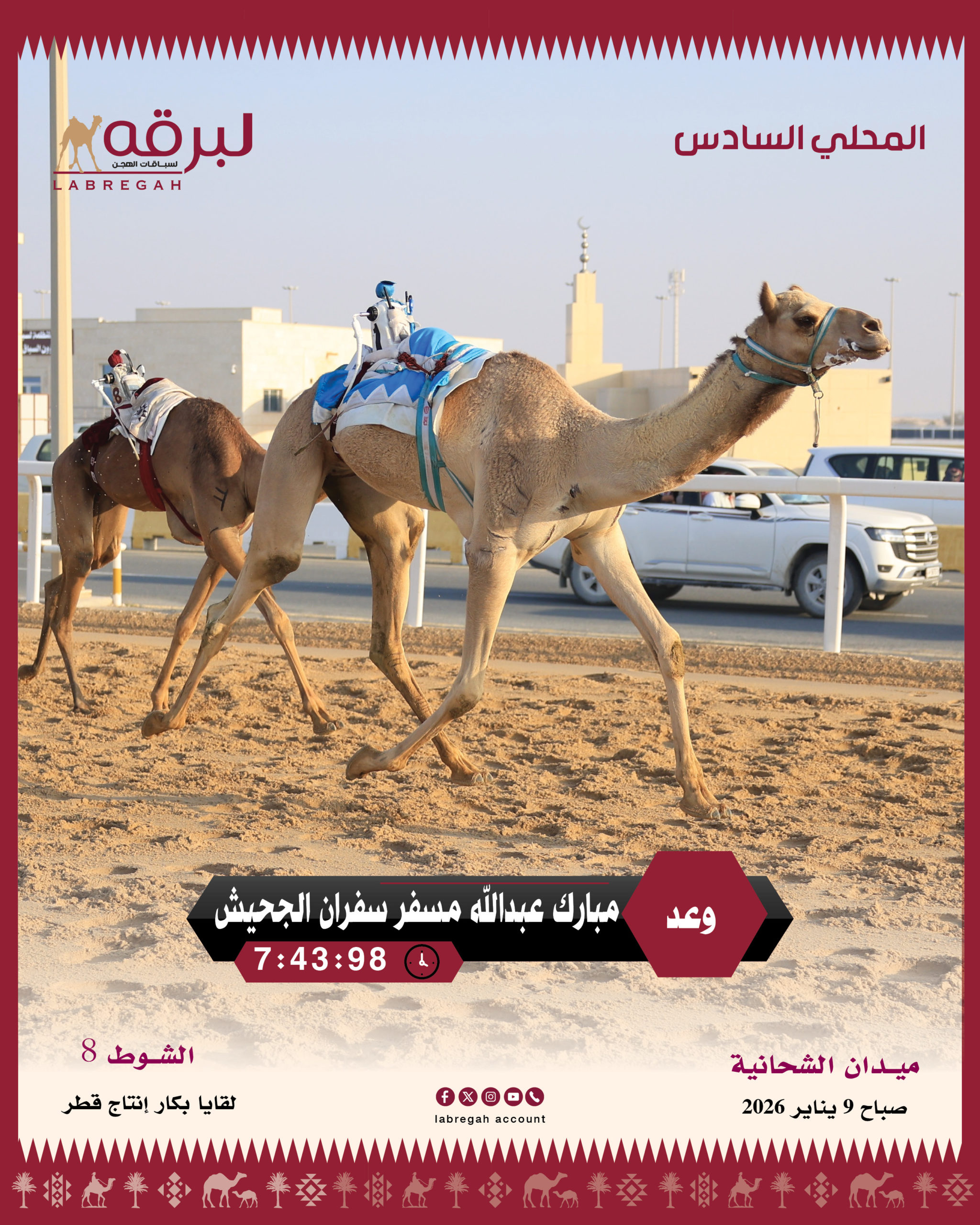 تواصلت الانطلاقات على على أرضية ميدان التحدي، ضمن فعاليات ومنافسات خامس أيام السباق المحلي السادس لسباقات الهجن العربية الأصيلة، الذي يقام تحت مظلة اللجنة المنظمة لسباق الهجن بدولتنا الحبيبة قطر، حيث خصصت منافسات الصباح لسن اللقايا من مسافة الـ 5 كم، وعلى مدار 16 شوطًا.