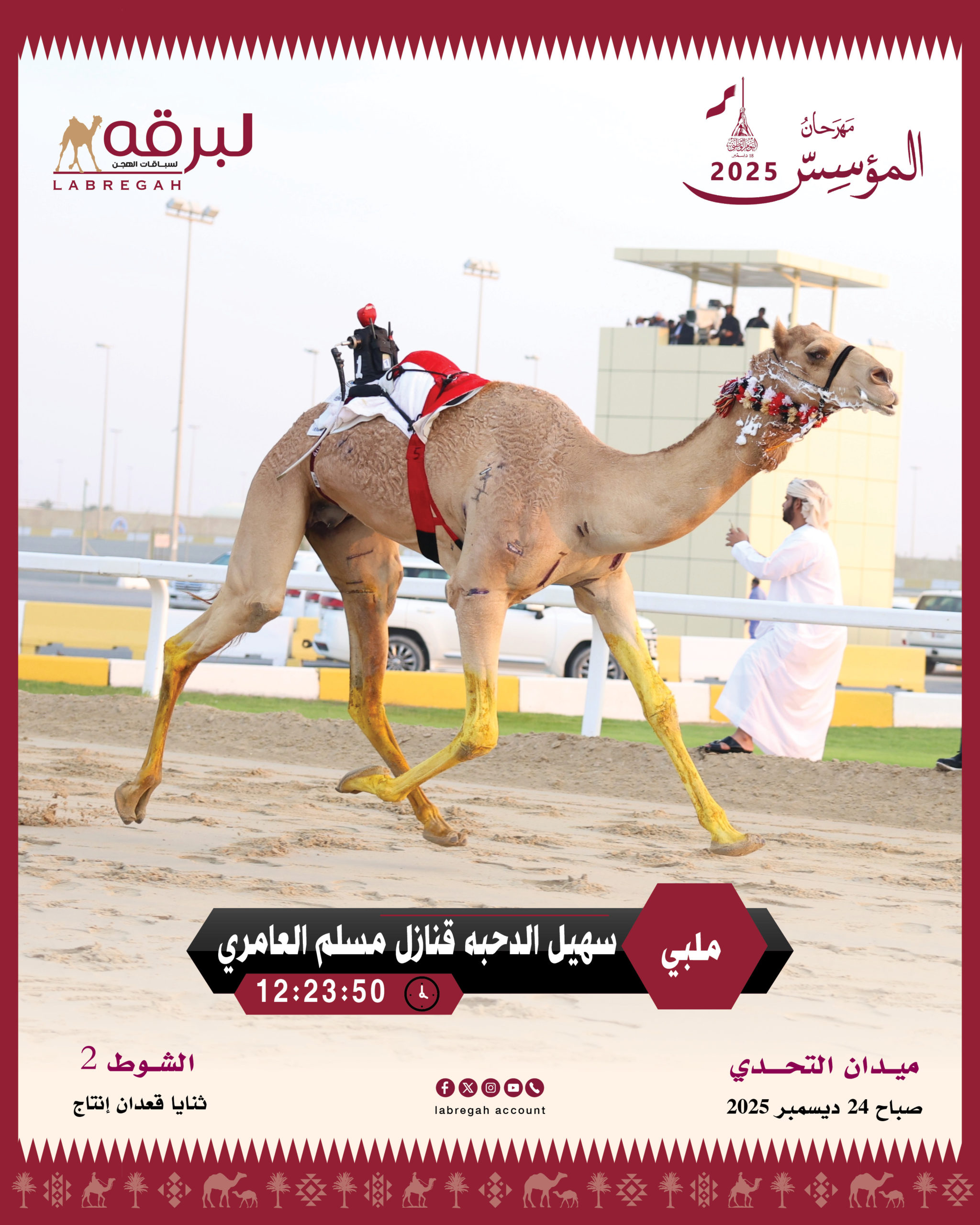 وفي شوط السباق الثاني المخصص للقعدان إنتاج، استطاع شعار سهيل الدحبة قنازل مسلم العامري، أن يغادر بالناموس على ظهر “ملبي” الذي استجاب لأوامر مالكه بكل دقة لينفرد بالصدارة ويحقق الفوز، بتوقيت زمني قدره 12.23.50 دقيقة، تاركًاا الوصافة لـ “والم” ملك خالد حمد راشد عبدالله النعيمي، والذي سجل 12.25.70 دقيقة، فيما جاء ثالثاً “هملول” ملك حميد حران حمد حميدان الفلاسي، بتوقيت 12.27.70 دقيقة.