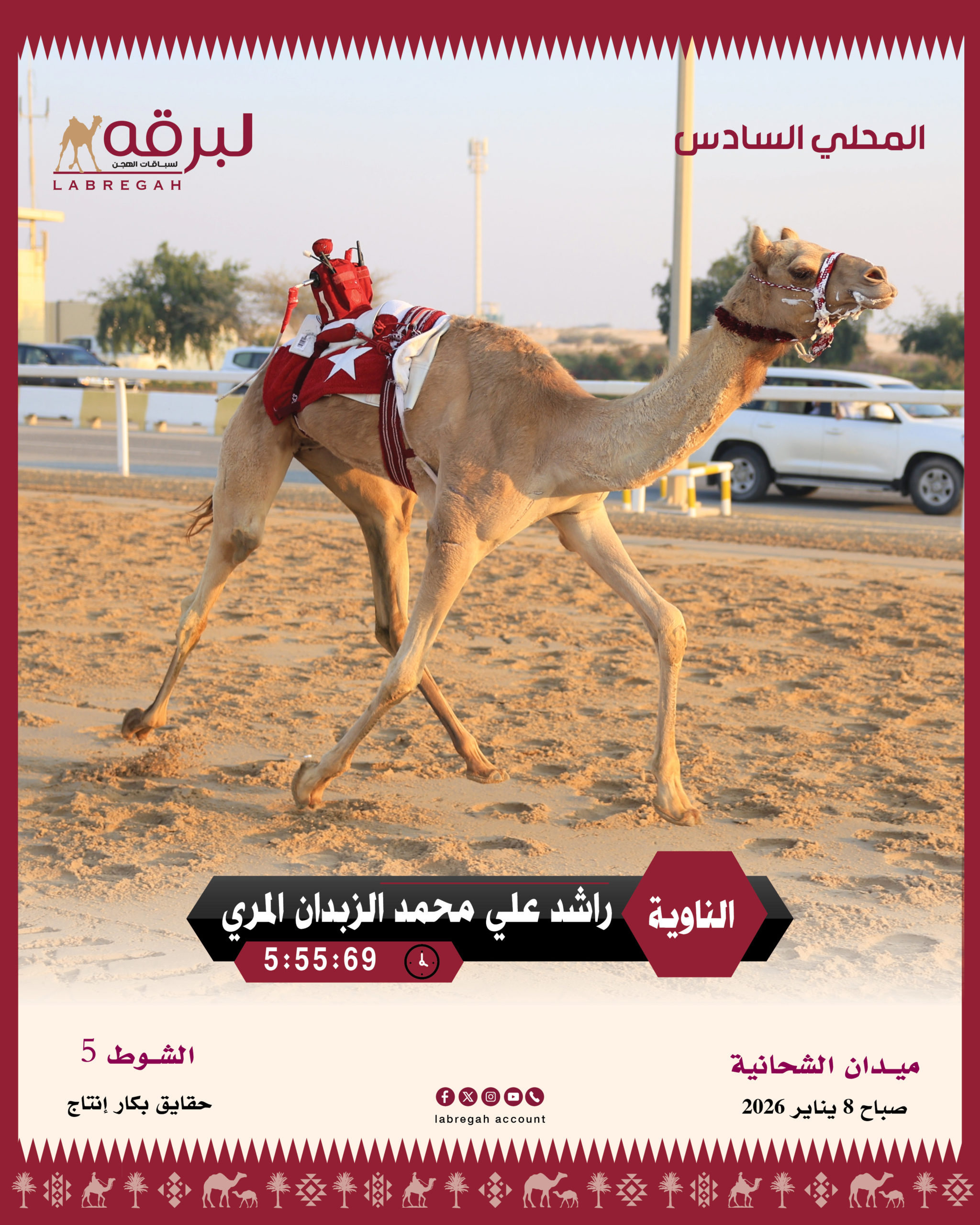أما أفضل توقيت فسجل تحت أقدام “الناوية” ملك راشد علي محمد الزبدان المري، والتي حسمت المركز الأول للشوط الخامس بكل أريحية، حيث سجلت توقيتًا قدره 5.55.69 دقيقة.