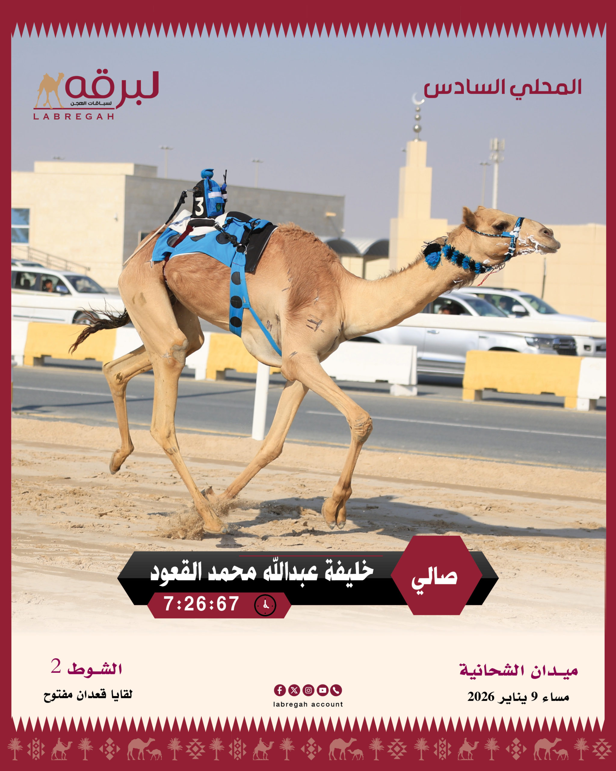 تواصلت الانطلاقات على أرضية ميدان الشحانية، لسن اللقايا العامة من هجن أبناء القبائل، ضمن فعاليات السباق المحلي السادس، وذلك مساء اليوم الجمعة 9 يناير 2026، حيث تنافست الهجن على مدار 14 شوطًا من مسافة الـ 5 كم..