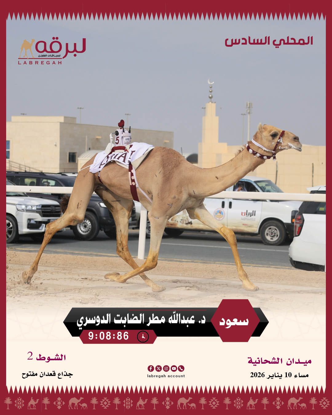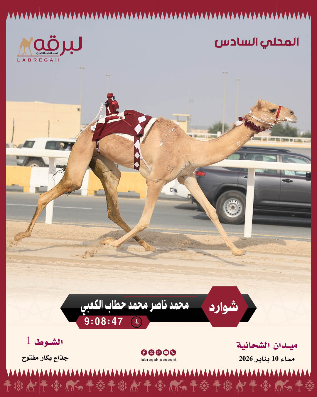 اختتمت مساء اليوم السبت 10 يناير 2026، منافسات سن الجذاع ضمن فعاليات اليوم السادس من السباق المحلي السادس، المقام على أرضية ميدان الشحانية تحت مظلة اللجنة المنظمة لسباق الهجن، للموسم 2025- 2026.