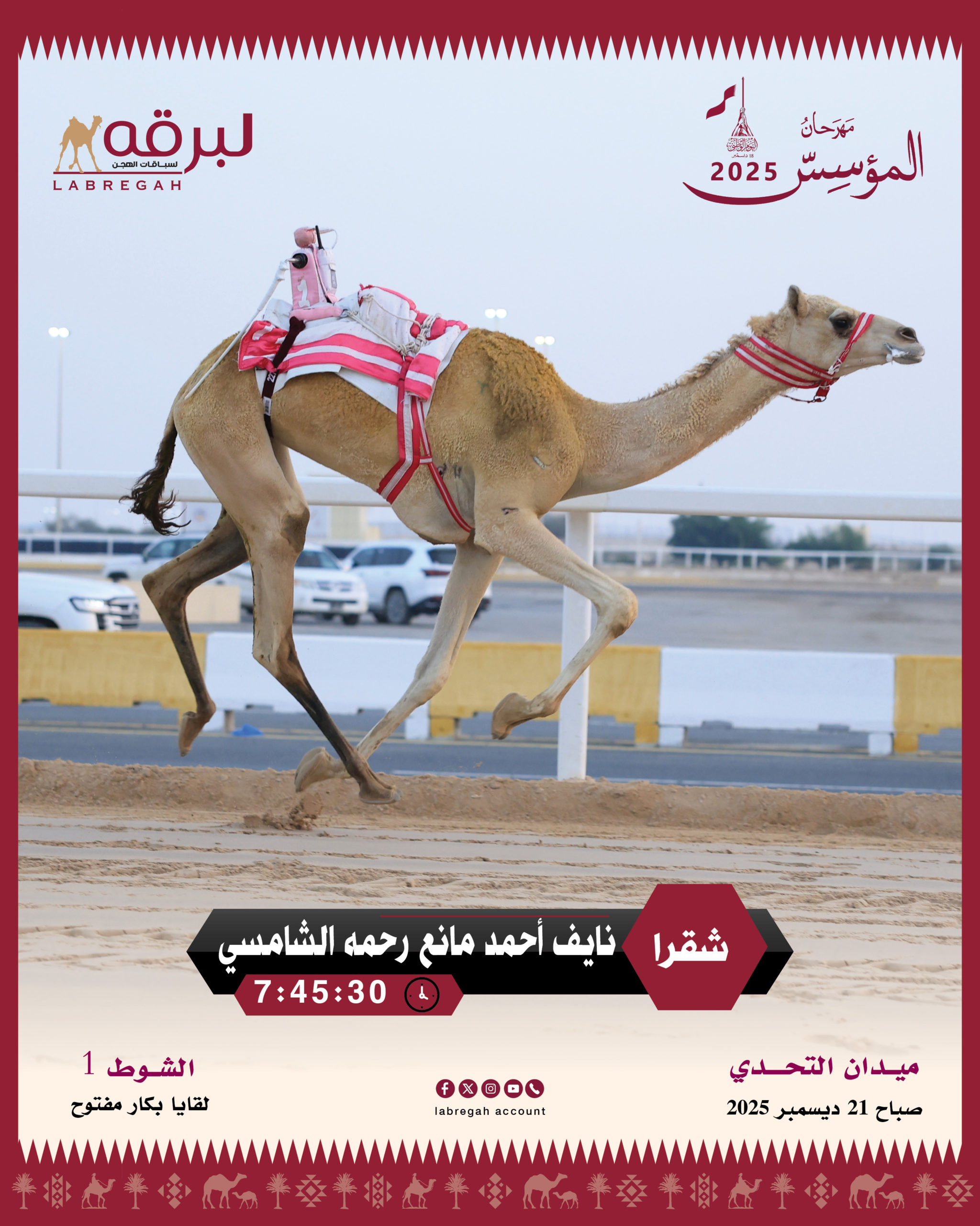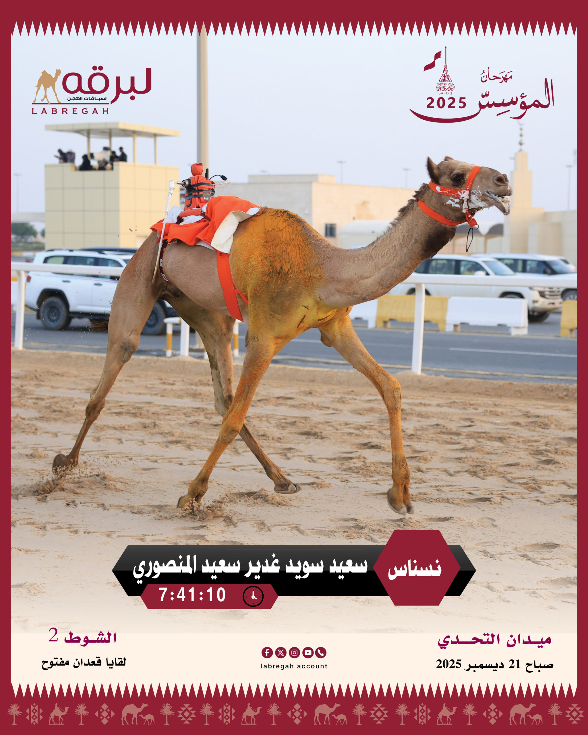 تناثرت شعارات أبناء القبائل من سن اللقايا على أرضية ميدان التحدي، حيث منافسات اليوم الرابع للأشواط العامة من المهرجان السنوي للهجن العربية الأصيلة على سيف المؤسس الشيخ جاسم بن محمد بن ثاني “طيب الله ثراه”، وخاضت 714 مطية وقعوداً المنافسات الصباحية ليوم الأحد الموافق 21 من ديسمبر 2025، على مدار 12 شوطًا من مسافة الـ 5 كم، الأشواط النقدية.