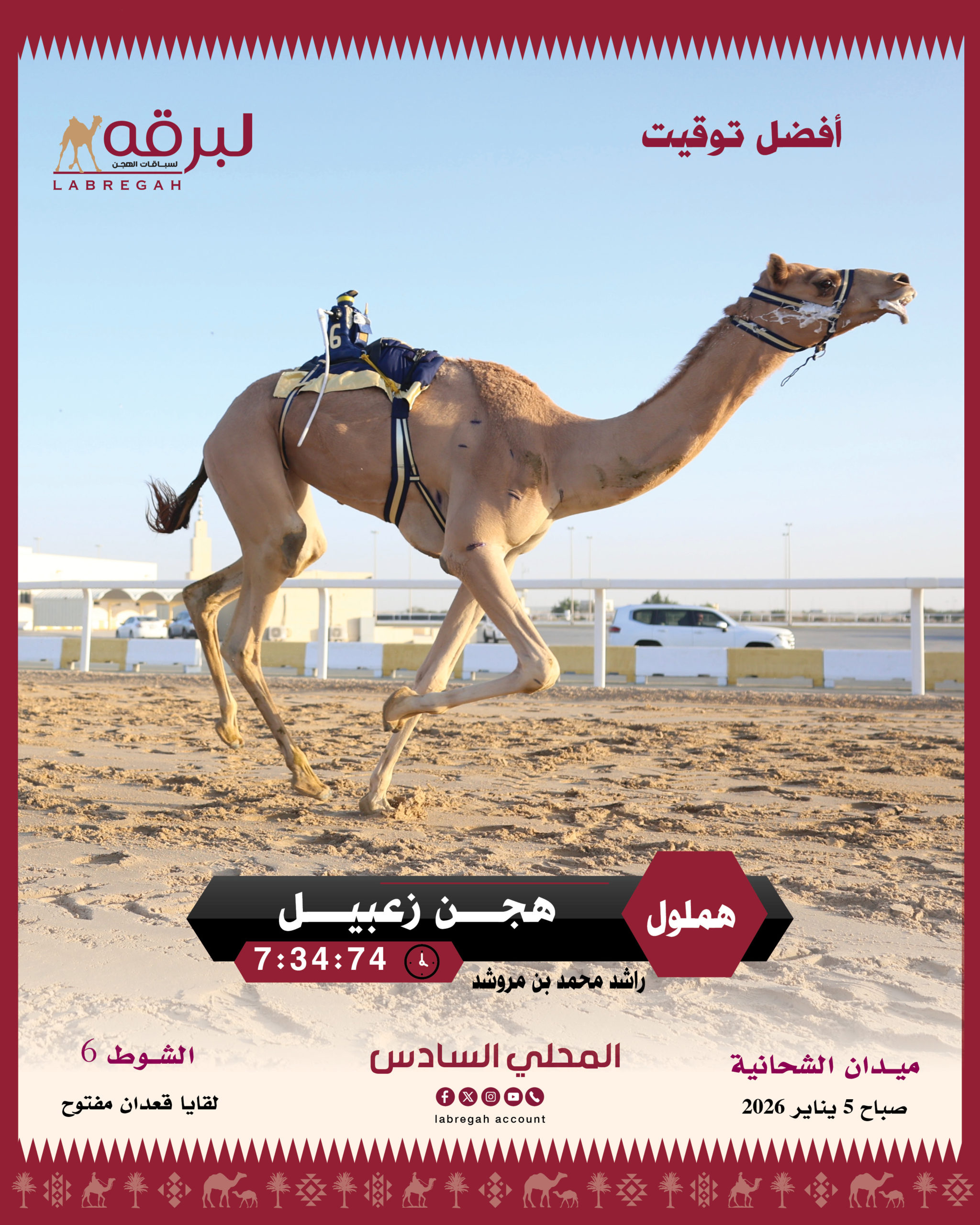 | الشوط السادس | 1 | هملول | هجن زعبيل | راشد محمد بن مروشد | 7:34:74 |