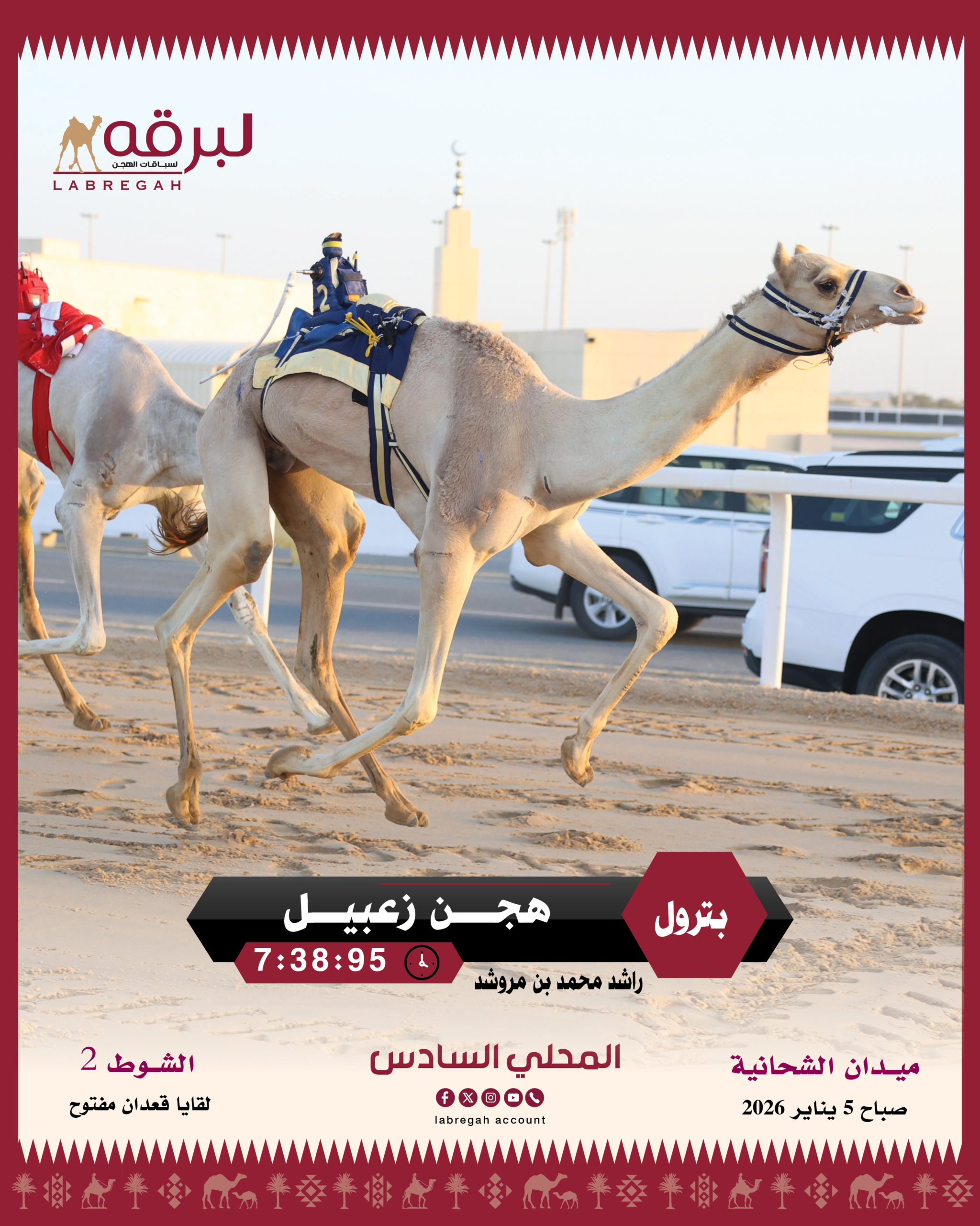 | الشوط الثاني | 1 | بترول | هجن زعبيل | راشد محمد بن مروشد | 7:38:95 |
