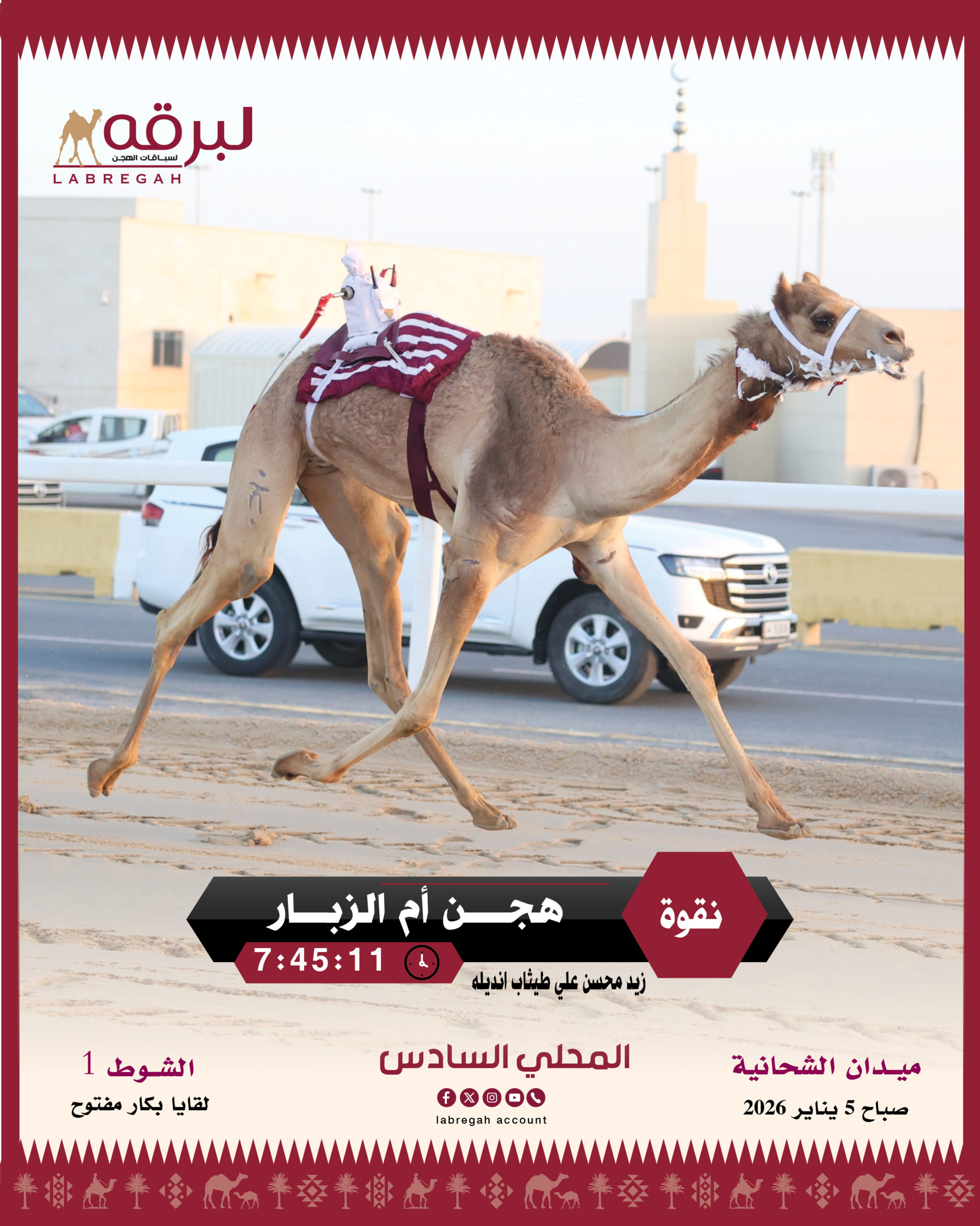| 3 | الذيب | هجن أم الزبار | عبدالله علي حمد سلامه الهاجري | 7:45:06 | |