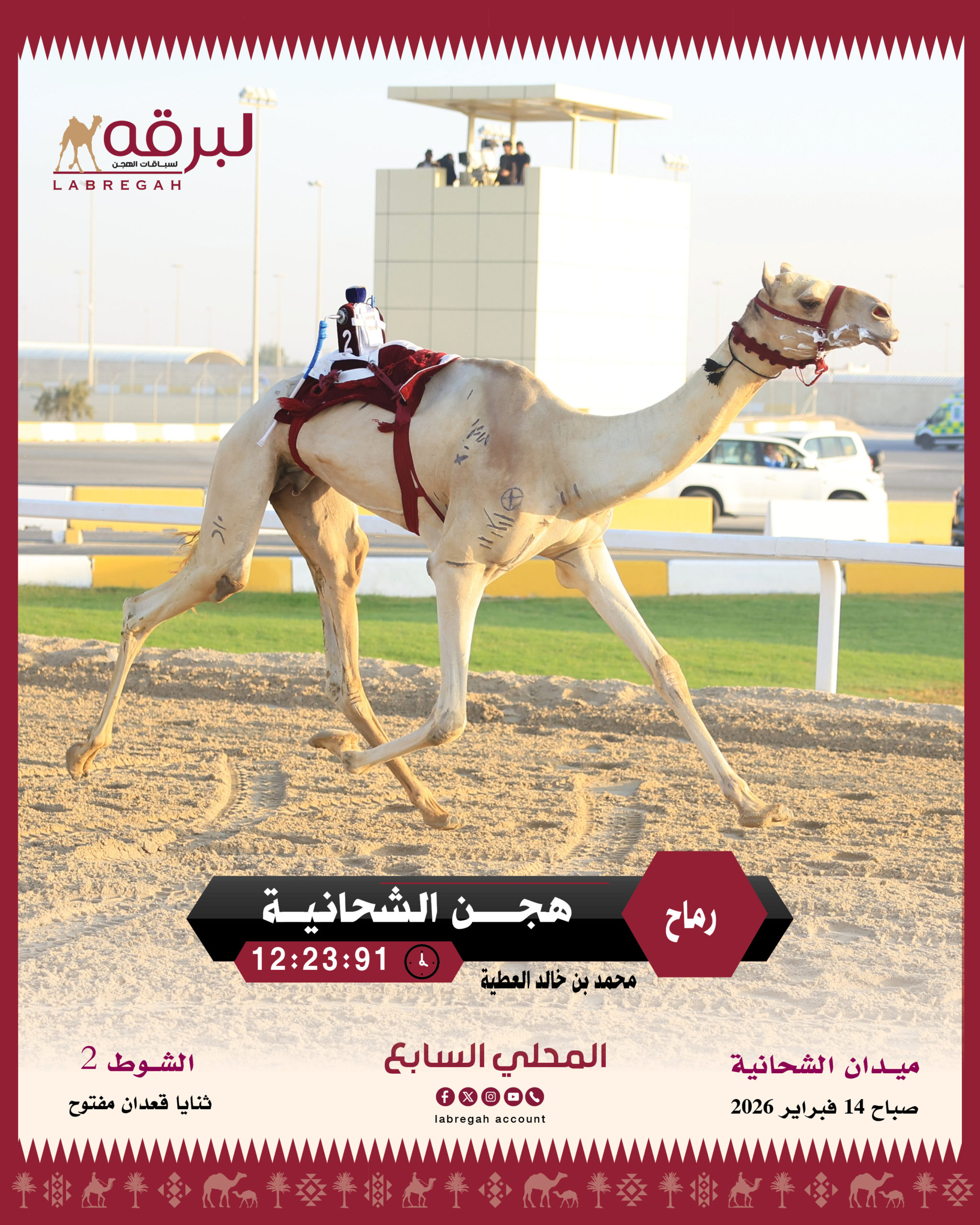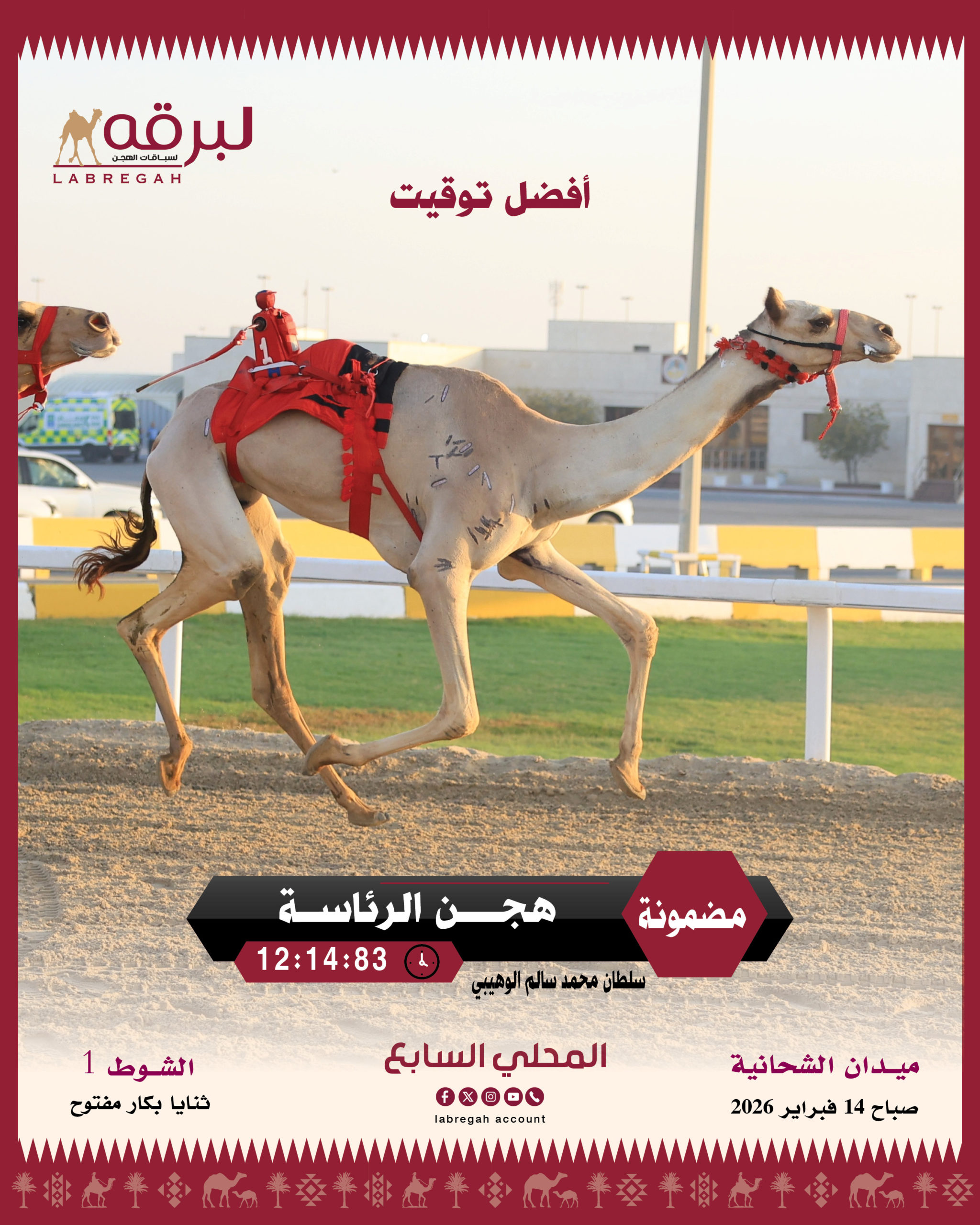 تواصلت صباح اليوم السبت 14 فبراير 2026 فعاليات ومنافسات السباق المحلي السابع، التي خُصصت لسنّ الثنايا من هجن أصحاب السمو والسعادة الشيوخ، على مدار 12 شوطًا لمسافة 8 كيلومترات، والتي شهدت إثارة وندية بين المؤسسات الكبرى.